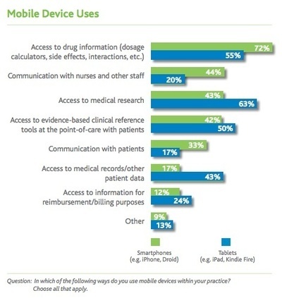 A Wolters Kluwer survey of 300 practicing physicians found 55 percent use both smartphones and tablets in their daily practice and of those, 72 percent primarily use smartphones for accessing drug information.