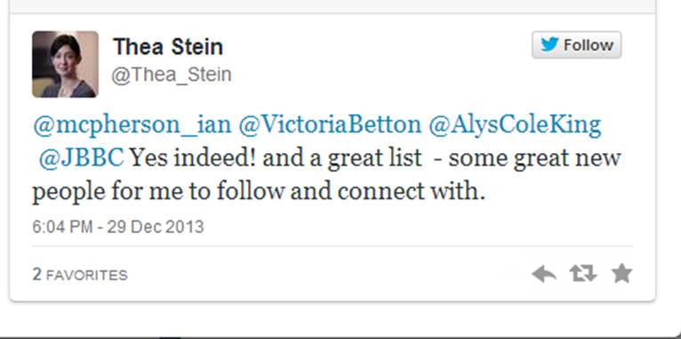 Even for those of us who are experienced Twitter users, we can always discover a new gem in an account we may not have come across before.  I know I can be guilty of swimming in the same Twitter pool and every now and again it is good to expand our horizons. I hope this list will help you (like Thea’s tweet indicates below) expand your network to make it even more valuable, global and inclusive.