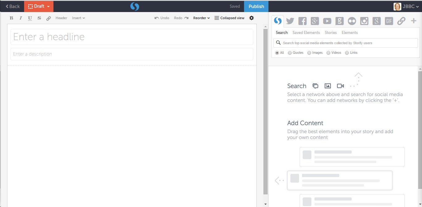 3. On the top right hand corner you will find media sources to curate the elements of your story. You can search Twitter, Facebook, YouTube, Flickr, and Google for elements to include.