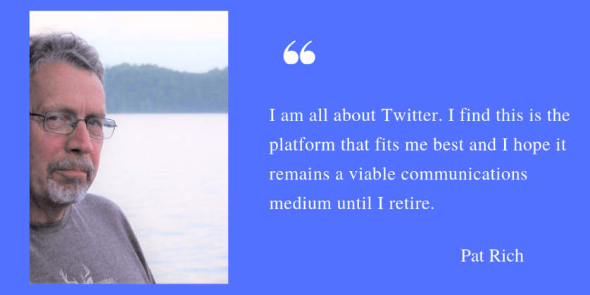 You were quite the early adopter Pat. I always think of Twitter when I think of your social media activity. Is this your favorite platform? Are there any others you enjoy using?