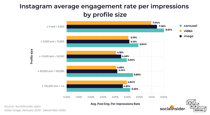 If you’re looking to increase your engagement rate, consider carousel posts which have the highest engagement rate per impression.