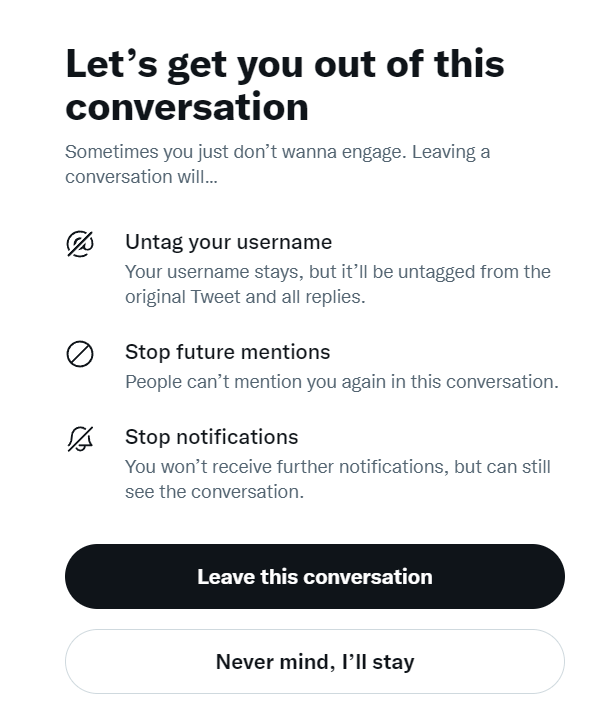 Choose leave this conversation and you will be untagged from the original Tweet and all replies. You can also see from the screenshot below, you have other options too – stop future mentions (people can’t mention you again in this conversation) and stop notifications (you won’t receive further notifications but will still see the conversation).
