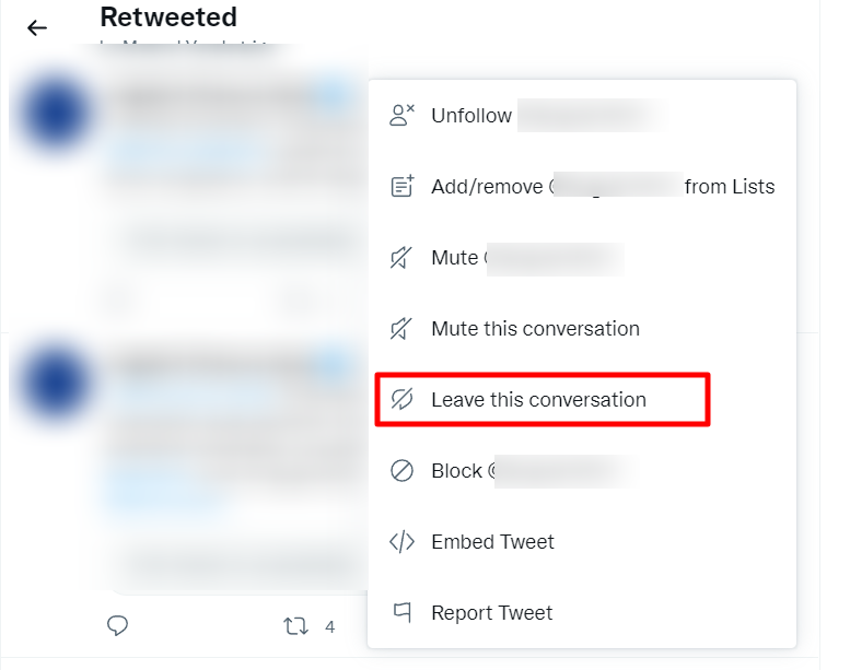 Simply click on the ellipses (three dots) beside the Twitter conversation you wish to leave.