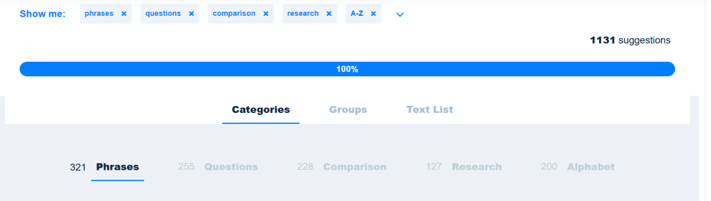 Enter your chosen keyword or phrase. My “social media” keyword returned over 1K suggestions!