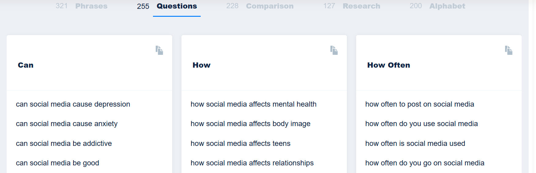 Enter your chosen keyword or phrase. My “social media” keyword returned over 1K suggestions!