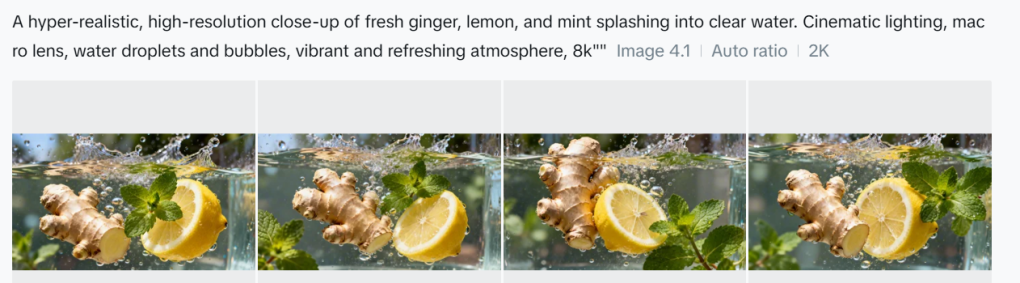 - For Wellness Branding: “A hyper-realistic, high-resolution close-up of fresh ginger, lemon, and mint splashing into clear water. Cinematic lighting, macro lens, water droplets and bubbles, vibrant and refreshing atmosphere.”