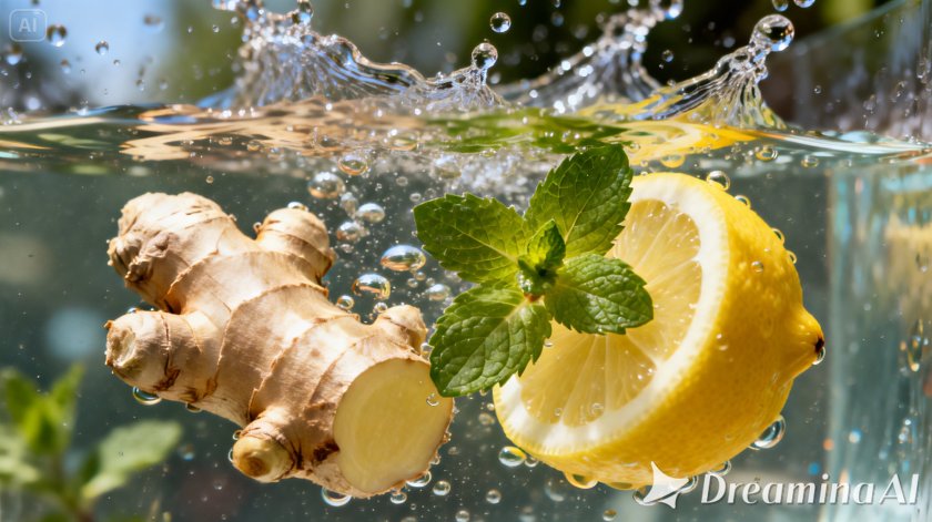 - For Wellness Branding: “A hyper-realistic, high-resolution close-up of fresh ginger, lemon, and mint splashing into clear water. Cinematic lighting, macro lens, water droplets and bubbles, vibrant and refreshing atmosphere.”